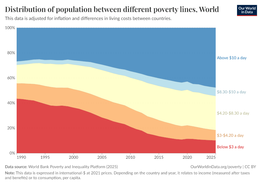 Extreme poverty — indeed a very extreme poverty line — is defined by the “International Poverty Line,” which is living on less than $3 per day. This line is set by the World Bank and used by the UN to monitor extreme poverty worldwide. In these measurements, statisticians adjust for inflation and price differences between countries. You can read more about this adjustment in our article here.