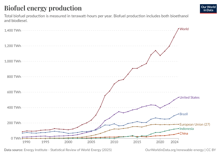 Hannah Ritchie and Pablo Rosado (2026) - “Putting solar panels on land used for biofuels would produce enough electricity for all cars and trucks to go electric” Published online at OurWorldinData.org. Retrieved from: 'https://tag-updates.owid.pages.dev:8789/20260123-150202/biofuel-land-solar-electric-vehicles.html' [Online Resource] (archived on January 23, 2026).BibTeX citation