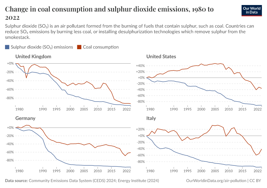 We can see this by looking more closely at the different rates at which these two measures declined. In the chart below, you can see the relative change in coal consumption and SO2 emissions since 1980 in four countries. In the UK, you can see that both lines dropped, but the reduction in SO2 happened at a faster rate and continued to fall during periods where coal consumption was stagnant, such as the early 2000s. This is because the UK implemented “scrubbing” technologies.