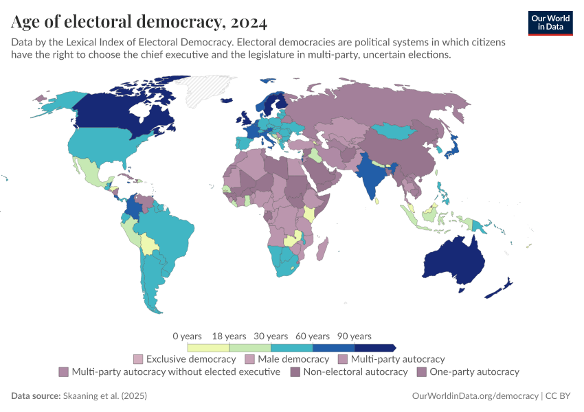 Bastian Herre (2022) - “In most countries, democracy is a recent achievement. Dictatorship is far from a distant memory.” Published online at OurWorldinData.org. Retrieved from: 'https://tag-updates.owid.pages.dev:8789/20260213-112438/democracies-age.html' [Online Resource] (archived on February 13, 2026).BibTeX citation