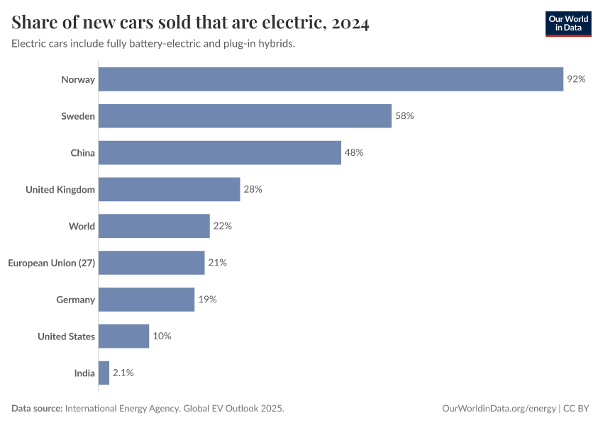 Globally, over 1-in-5 (22%) of new cars sold were electric in 2024. This share was 92% in Norway, and in China, it was almost 50%.