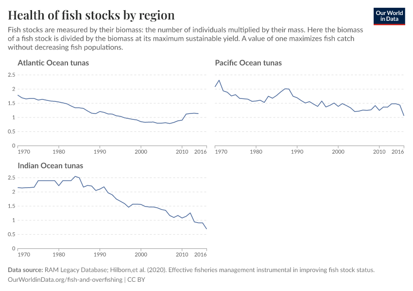 This is often measured in terms of fish stocks. A fish stock is a subpopulation of a particular species of fish with common parameters such as location, growth, and mortality. Often, it’s a species of fish in a given location. Indian Ocean tuna, for example. Importantly, this metric treats each fish stock as being equal, regardless of how big each stock is. A stock where we catch 1000 tonnes is counted the same as a stock where we catch 10 tonnes.
