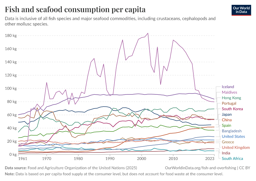 In the charts here, we see the average per capita consumption of fish and seafood across the world.6 The highest seafood consumers are countries including Iceland, the Maldives, and Hong Kong. Contrast that with those at the bottom of the table: landlocked countries such as Mongolia, Afghanistan, and Niger understandably eat relatively little fish.