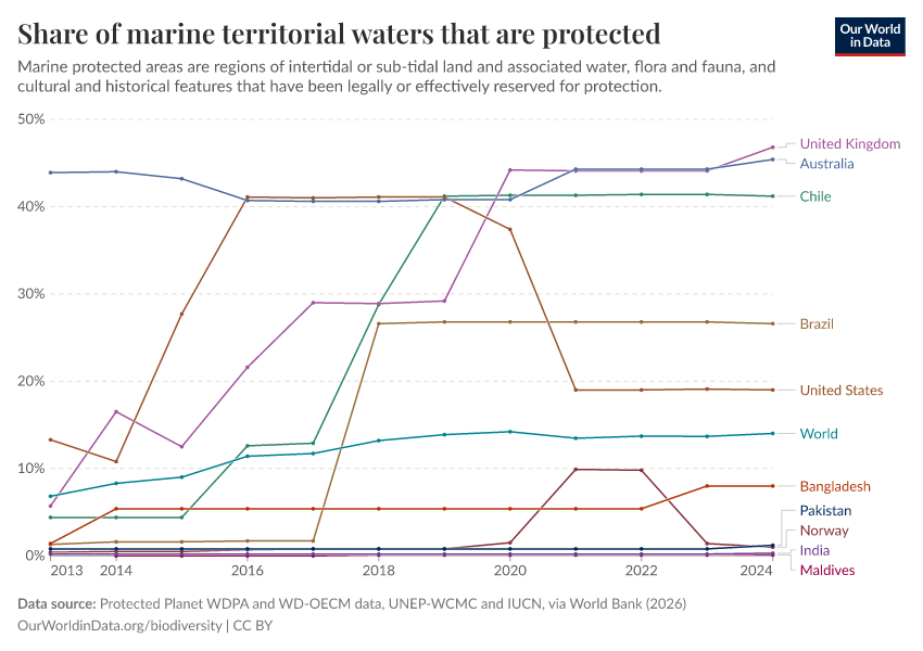 In the charts here, we see the share of territorial waters that are protected in each country. This does not include international waters (‘high seas’).