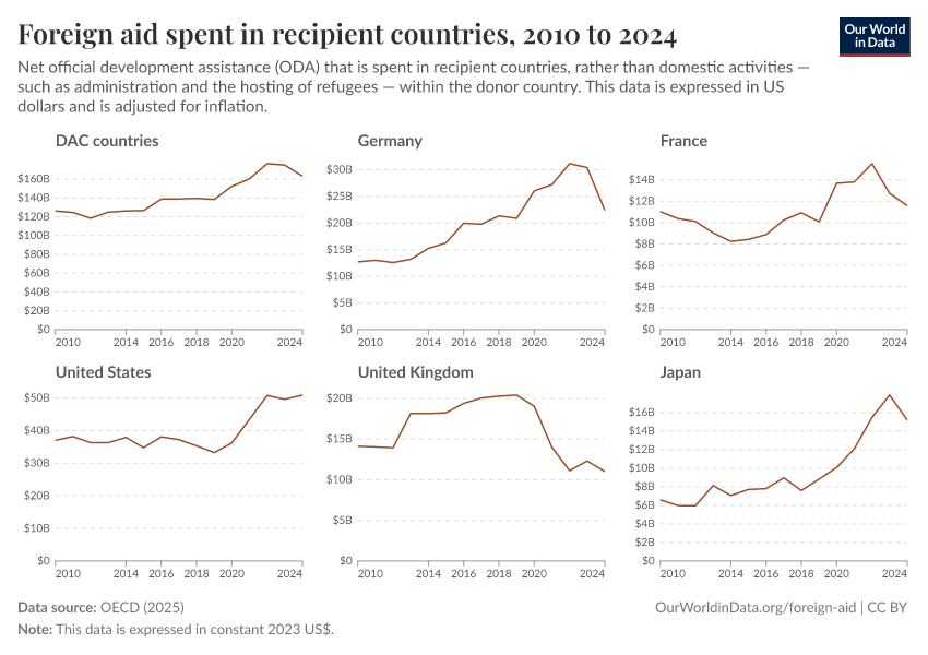 Simon van Teutem, Hannah Ritchie, and Pablo Arriagada (2025) - “How much foreign aid is spent domestically rather than overseas?” Published online at OurWorldinData.org. Retrieved from: 'https://tag-updates.owid.pages.dev:8789/20260223-070107/foreign-aid-domestic-overseas.html' [Online Resource] (archived on February 23, 2026).BibTeX citation