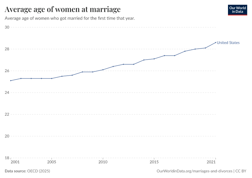 OECD (2025) – with minor processing by Our World in Data. “Average age of women at marriage” [dataset]. OECD, “OECD Family Database - Marriage and Divorce Rates” [original data]. Retrieved February 27, 2026 from https://tag-updates.owid.pages.dev:8789/20251008-084854/grapher/age-at-marriage-women.html (archived on October 8, 2025).