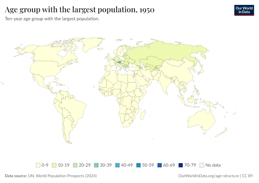 “Data Page: Ten year age-group with the highest population”. Our World in Data (2026). Data adapted from United Nations. Retrieved from https://tag-updates.owid.pages.dev:8789/20260225-014904/grapher/age-group-with-the-largest-population.html [online resource] (archived on February 25, 2026).How to cite this data