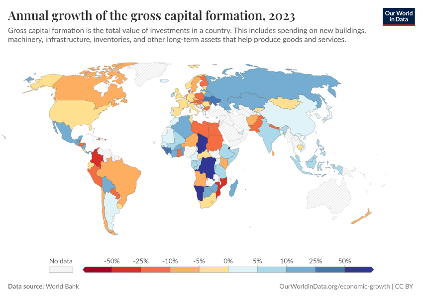 “Data Page: Annual growth of the gross capital formation”, part of the following publication: Max Roser, Bertha Rohenkohl, Pablo Arriagada, Joe Hasell, Hannah Ritchie, and Esteban Ortiz-Ospina (2023) - “Economic Growth”. Data adapted from World Bank. Retrieved from https://tag-updates.owid.pages.dev:8789/20260130-180113/grapher/annual-growth-of-the-gross-capital-formation.html [online resource] (archived on January 30, 2026).How to cite this data
