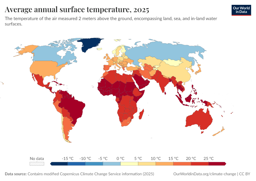 Contains modified Copernicus Climate Change Service information (2025) – with major processing by Our World in Data. “Average annual surface temperature” [dataset]. Contains modified Copernicus Climate Change Service information, “ERA5 monthly averaged data on single levels from 1940 to present 2” [original data]. Retrieved February 27, 2026 from https://tag-updates.owid.pages.dev:8789/20260225-180245/grapher/average-annual-surface-temperature.html (archived on February 25, 2026).