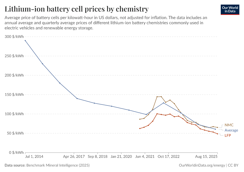 Benchmark Mineral Intelligence (2025) – with minor processing by Our World in Data. “Lithium-ion battery cell prices by chemistry” [dataset]. Benchmark Mineral Intelligence, “Lithium-ion battery prices”; Benchmark Mineral Intelligence, “Battery prices by chemistry” [original data]. Retrieved February 27, 2026 from https://tag-updates.owid.pages.dev:8789/20260108-171008/grapher/average-battery-cell-price.html (archived on January 8, 2026).