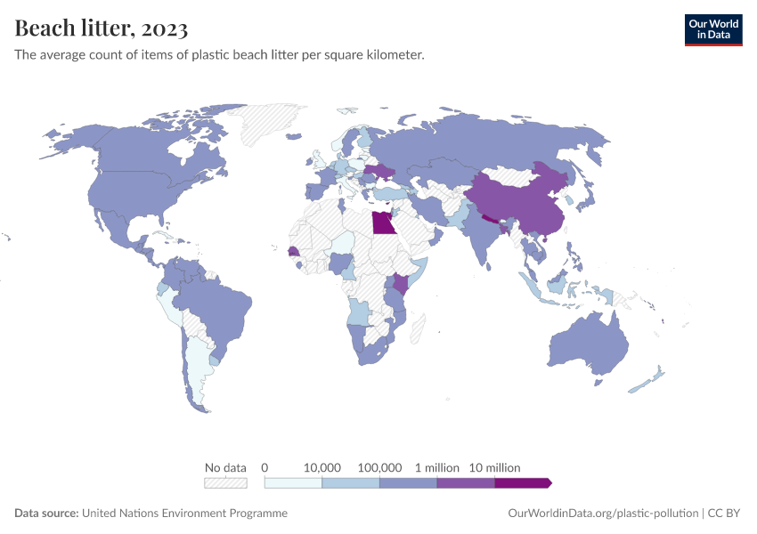 United Nations Environment Programme – with minor processing by Our World in Data. “Beach litter” [dataset]. United Nations Environment Programme, “Data from multiple sources” [original data]. Retrieved February 27, 2026 from https://tag-updates.owid.pages.dev:8789/20260105-133053/grapher/beach-litter.html (archived on January 5, 2026).