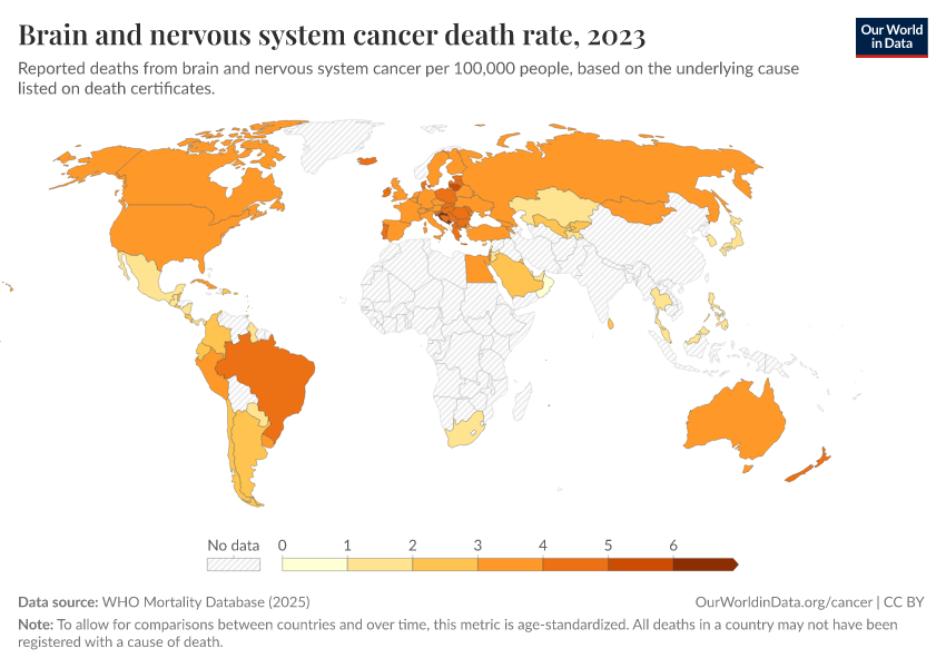 WHO Mortality Database (2025) – with minor processing by Our World in Data. “Brain and nervous system cancer death rate” [dataset]. WHO Mortality Database, “WHO Mortality Database” [original data]. Retrieved February 27, 2026 from https://tag-updates.owid.pages.dev:8789/20250909-093708/grapher/brain-and-nervous-system-cancer-death-rate.html (archived on September 9, 2025).