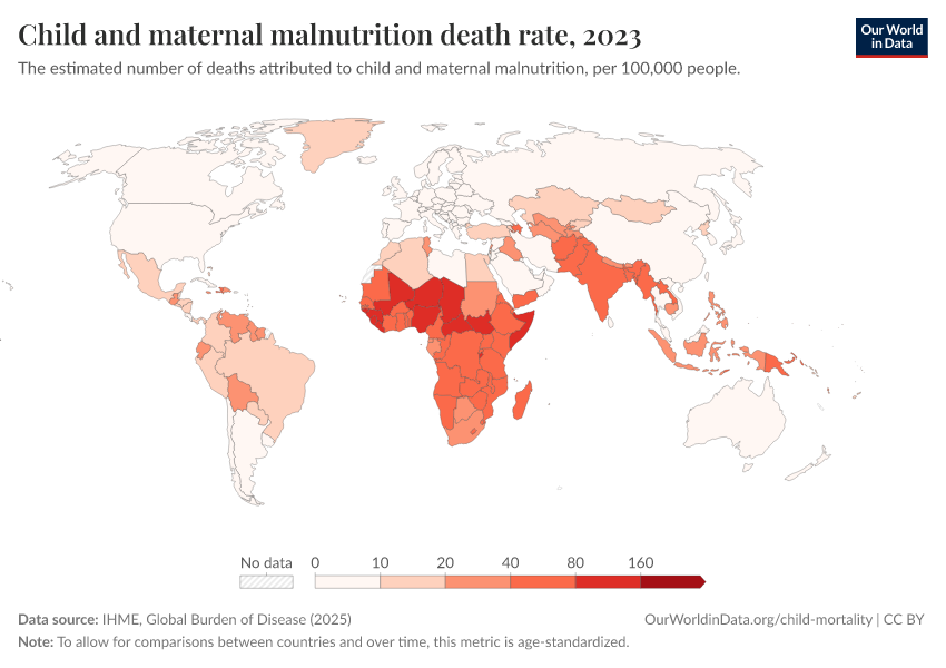 IHME, Global Burden of Disease (2025) – with major processing by Our World in Data. “Child and maternal malnutrition death rate” [dataset]. IHME, Global Burden of Disease, “Global Burden of Disease - Risk Factors - Deaths” [original data]. Retrieved February 27, 2026 from https://tag-updates.owid.pages.dev:8789/20260213-112438/grapher/child-and-maternal-malnutrition-death-rate.html (archived on February 13, 2026).
