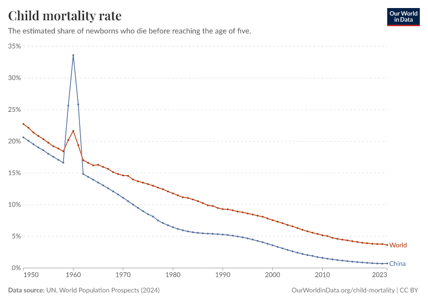 UN, World Population Prospects (2024) – processed by Our World in Data. “Child mortality rate, ages 0-4 – UN WPP” [dataset]. United Nations, “World Population Prospects” [original data]. Retrieved February 27, 2026 from https://tag-updates.owid.pages.dev:8789/20260225-004721/grapher/child-mortality-around-the-world.html (archived on February 25, 2026).
