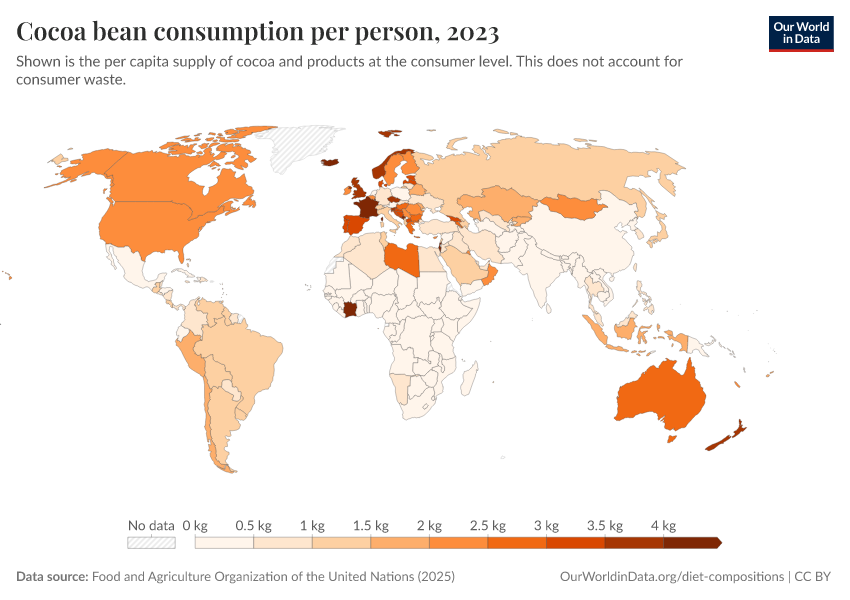 “Data Page: Yearly per capita supply of cocoa beans”. Our World in Data (2026). Data adapted from Food and Agriculture Organization of the United Nations. Retrieved from https://tag-updates.owid.pages.dev:8789/20260226-122020/grapher/chocolate-consumption-per-person.html [online resource] (archived on February 26, 2026).How to cite this data