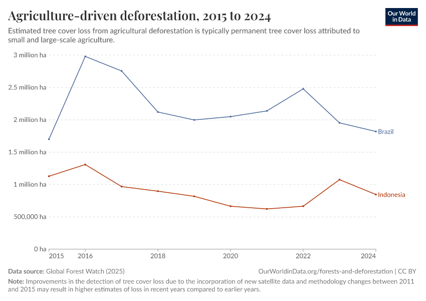 Global Forest Watch (2025) – with major processing by Our World in Data. “Agriculture-driven deforestation” [dataset]. Global Forest Watch, “Tree Cover Loss by Dominant Driver” [original data]. Retrieved February 27, 2026 from https://tag-updates.owid.pages.dev:8789/20260119-065148/grapher/commodity-driven-deforestation.html (archived on January 19, 2026).