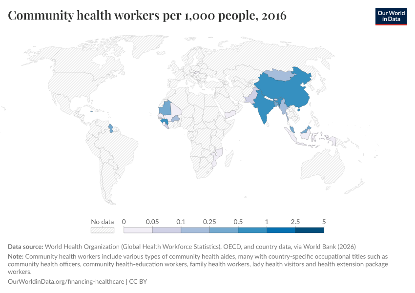 “Data Page: Community health workers per 1,000 people”. Our World in Data (2026). Data adapted from World Health Organization (Global Health Workforce Statistics), OECD, and country data, via World Bank. Retrieved from https://tag-updates.owid.pages.dev:8789/20260202-181317/grapher/community-health-workers.html [online resource] (archived on February 2, 2026).How to cite this data