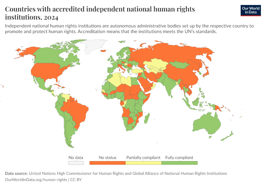 United Nations High Commissioner for Human Rights and Global Alliance of National Human Rights Institutions – with minor processing by Our World in Data. “Countries with accredited independent national human rights institutions” [dataset]. United Nations High Commissioner for Human Rights and Global Alliance of National Human Rights Institutions, “Source: The Office of the United Nations High Commissioner for Human Rights (OHCHR) in collaboration with Global Alliance of National Human Rights Institutions (GANHRI).” [original data]. Retrieved February 27, 2026 from https://tag-updates.owid.pages.dev:8789/20251120-211038/grapher/countries-with-independent-national-human-rights-institution.html (archived on November 20, 2025).