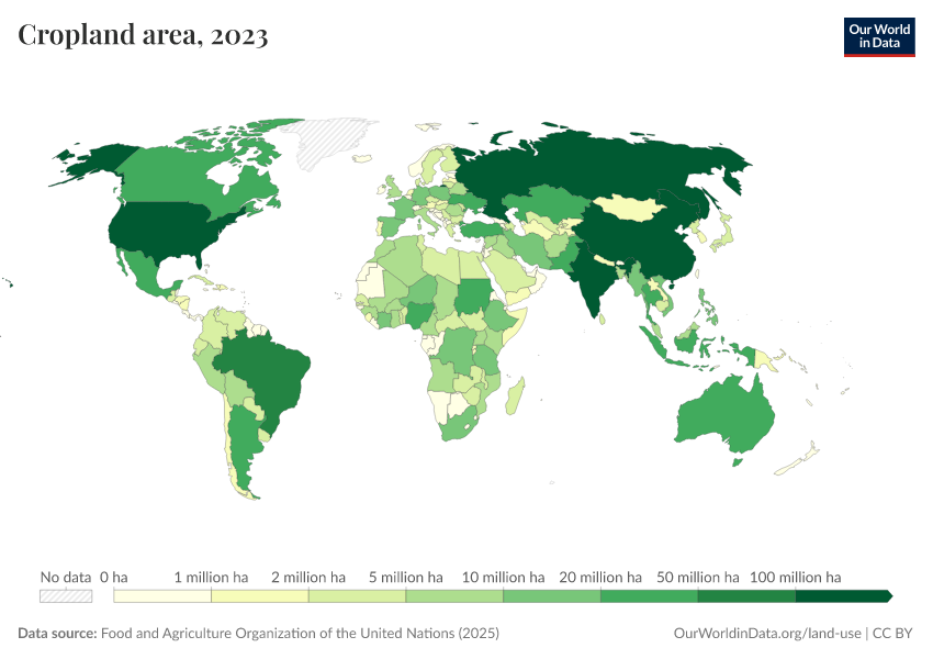 “Data Page: Cropland area”, part of the following publication: Hannah Ritchie, Pablo Rosado, and Max Roser (2023) - “Agricultural Production”. Data adapted from Food and Agriculture Organization of the United Nations. Retrieved from https://tag-updates.owid.pages.dev:8789/20260226-122020/grapher/cropland-area.html [online resource] (archived on February 26, 2026).How to cite this data