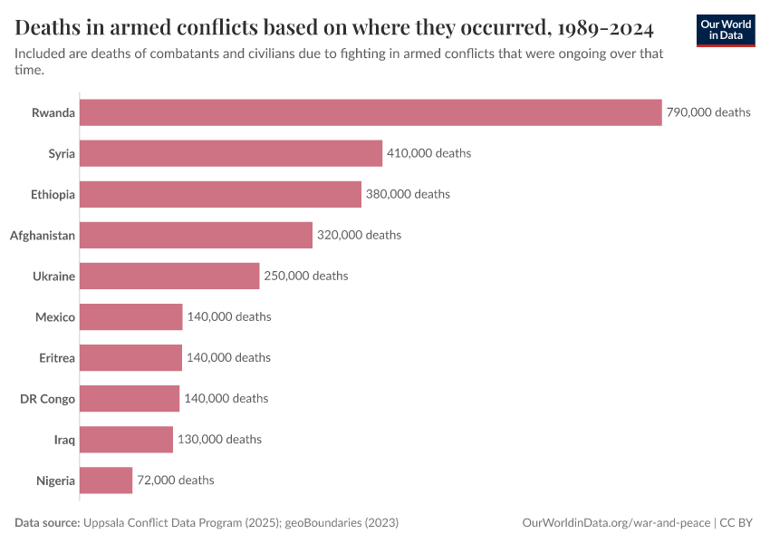 “Data Page: Deaths in armed conflicts based on where they occurred, 1989-2024”, part of the following publication: Bastian Herre, Lucas Rodés-Guirao, and Max Roser (2024) - “War and Peace”. Data adapted from Uppsala Conflict Data Program, Natural Earth. Retrieved from https://tag-updates.owid.pages.dev:8789/20250909-093708/grapher/cumulative-deaths-in-armed-conflicts.html [online resource] (archived on September 9, 2025).