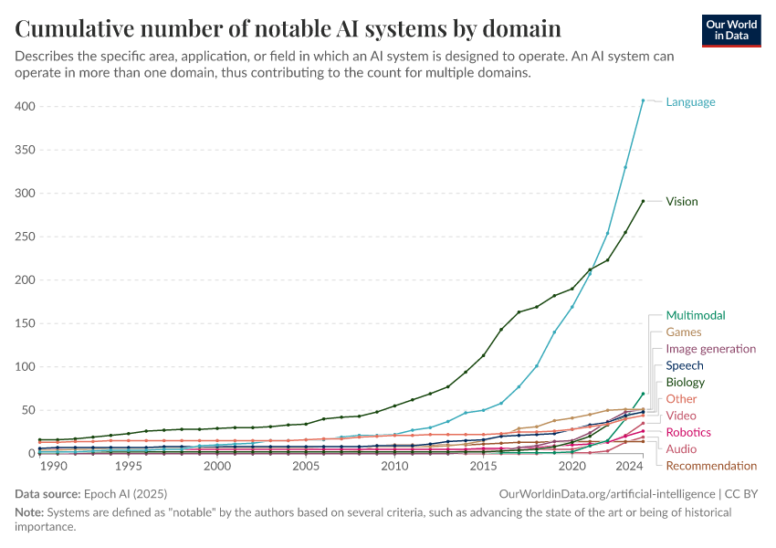 Epoch AI (2025) – with major processing by Our World in Data. “Cumulative number of notable AI systems by domain” [dataset]. Epoch AI, “Parameter, Compute and Data Trends in Machine Learning” [original data]. Retrieved February 27, 2026 from https://tag-updates.owid.pages.dev:8789/20260126-094752/grapher/cumulative-number-of-notable-ai-systems-by-domain.html (archived on January 26, 2026).