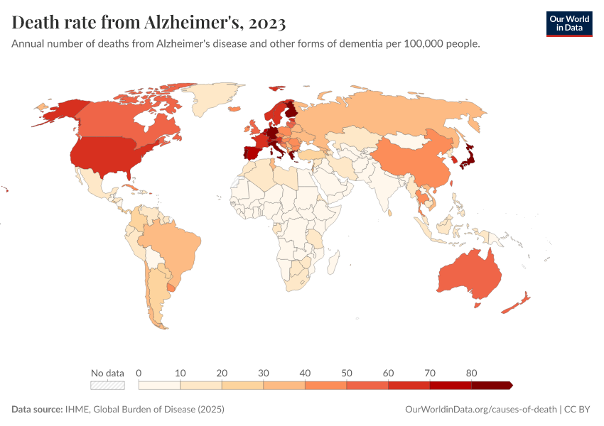 “Data Page: Death rate from Alzheimer's”, part of the following publication: Esteban Ortiz-Ospina and Max Roser (2016) - “Global Health”. Data adapted from IHME, Global Burden of Disease. Retrieved from https://tag-updates.owid.pages.dev:8789/20260211-174736/grapher/death-rate-from-alzheimers-other-dementias-gbd.html [online resource] (archived on February 11, 2026).How to cite this data