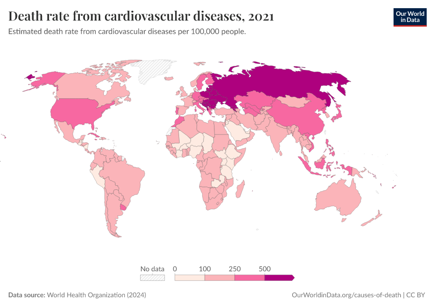 World Health Organization (2024) – with major processing by Our World in Data. “Death rate from cardiovascular diseases” [dataset]. World Health Organization, “Global Health Estimates” [original data]. Retrieved February 27, 2026 from https://tag-updates.owid.pages.dev:8789/20250909-093708/grapher/death-rate-from-cardiovascular-disease-ghe.html (archived on September 9, 2025).