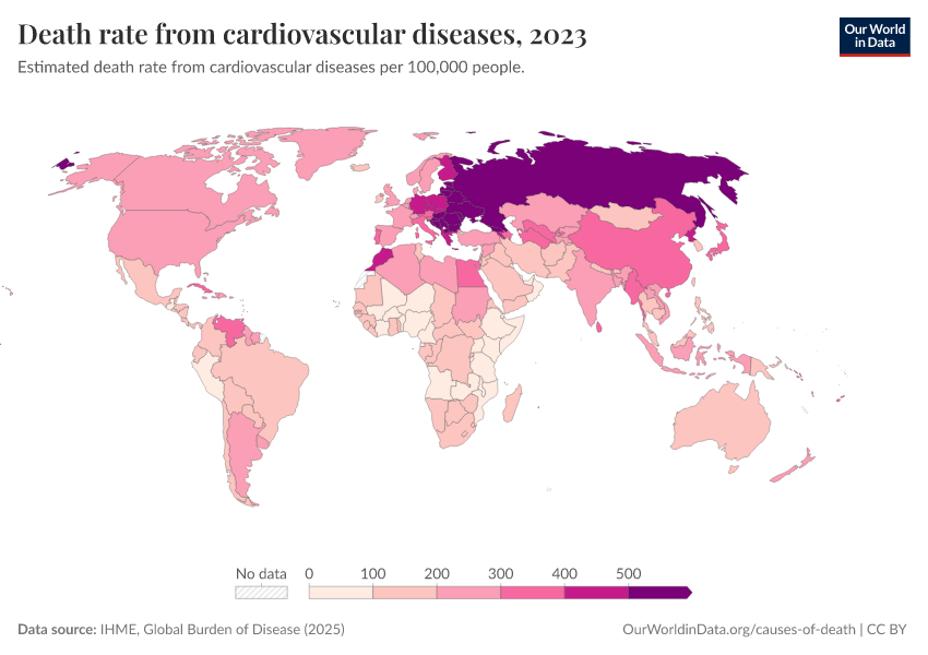 IHME, Global Burden of Disease (2025) – with major processing by Our World in Data. “Death rate from cardiovascular diseases” [dataset]. IHME, Global Burden of Disease, “Global Burden of Disease - Deaths” [original data]. Retrieved February 27, 2026 from https://tag-updates.owid.pages.dev:8789/20260211-174736/grapher/death-rate-from-cardiovascular-diseases.html (archived on February 11, 2026).