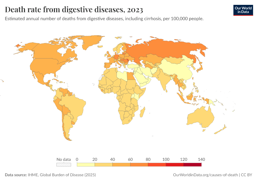 IHME, Global Burden of Disease (2025) – with major processing by Our World in Data. “Death rate from digestive diseases” [dataset]. IHME, Global Burden of Disease, “Global Burden of Disease - Deaths” [original data]. Retrieved February 27, 2026 from https://tag-updates.owid.pages.dev:8789/20260211-174736/grapher/death-rate-from-digestive-diseases-gbd.html (archived on February 11, 2026).