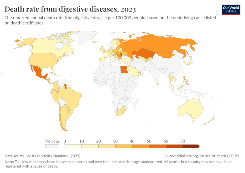 “Data Page: Death rate from digestive diseases”, part of the following publication: Saloni Dattani, Fiona Spooner, Hannah Ritchie, and Max Roser (2023) - “Causes of Death”. Data adapted from WHO Mortality Database. Retrieved from https://tag-updates.owid.pages.dev:8789/20250909-093708/grapher/death-rate-from-digestive-diseases-who-mdb.html [online resource] (archived on September 9, 2025).How to cite this data