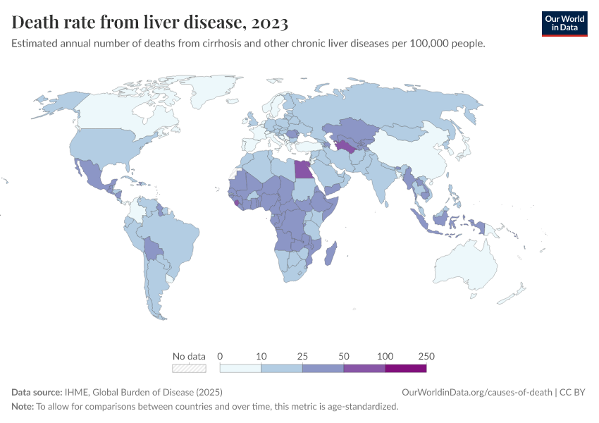 IHME, Global Burden of Disease (2025) – with major processing by Our World in Data. “Death rate from liver disease” [dataset]. IHME, Global Burden of Disease, “Global Burden of Disease - Deaths” [original data]. Retrieved February 27, 2026 from https://tag-updates.owid.pages.dev:8789/20260211-174736/grapher/death-rate-from-liver-disease.html (archived on February 11, 2026).