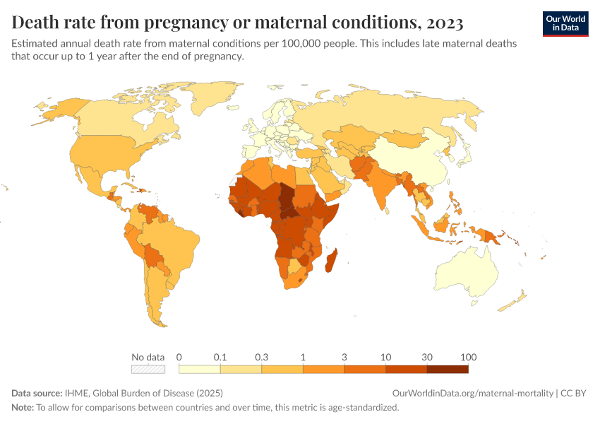 IHME, Global Burden of Disease (2025) – with major processing by Our World in Data. “Death rate from pregnancy or maternal conditions” [dataset]. IHME, Global Burden of Disease, “Global Burden of Disease - Deaths” [original data]. Retrieved February 27, 2026 from https://tag-updates.owid.pages.dev:8789/20260211-174736/grapher/death-rate-from-maternal-disorders-ihme.html (archived on February 11, 2026).