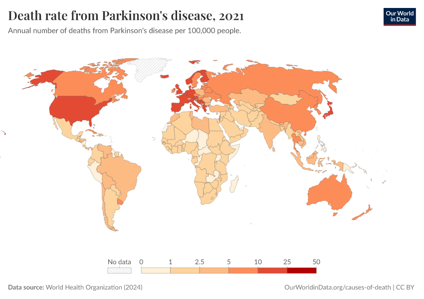 “Data Page: Death rate from Parkinson's disease”, part of the following publication: Esteban Ortiz-Ospina and Max Roser (2016) - “Global Health”. Data adapted from World Health Organization. Retrieved from https://tag-updates.owid.pages.dev:8789/20250909-093708/grapher/death-rate-from-parkinsons-disease-ghe.html [online resource] (archived on September 9, 2025).How to cite this data