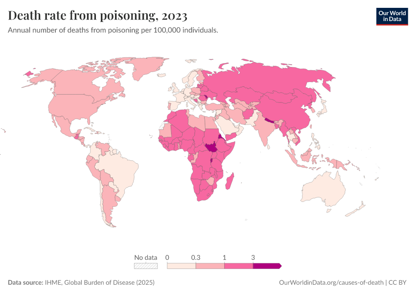 “Data Page: Death rate from poisoning”, part of the following publication: Esteban Ortiz-Ospina and Max Roser (2016) - “Global Health”. Data adapted from IHME, Global Burden of Disease. Retrieved from https://tag-updates.owid.pages.dev:8789/20260211-174736/grapher/death-rate-from-poisoning-gbd.html [online resource] (archived on February 11, 2026).How to cite this data