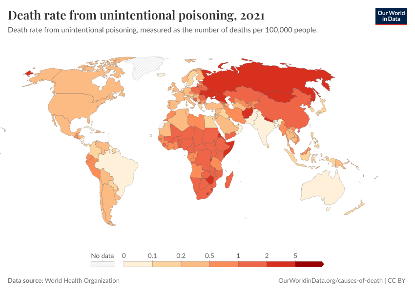 World Health Organization – with minor processing by Our World in Data. “Death rate from unintentional poisoning” [dataset]. World Health Organization, “Global Health Estimates 2021: Deaths by Cause, Age, Sex, by Country and by Region, 2000-2021. Geneva, World Health Organization, 2024” [original data]. Retrieved February 27, 2026 from https://tag-updates.owid.pages.dev:8789/20260130-180113/grapher/death-rate-from-poisonings.html (archived on January 30, 2026).