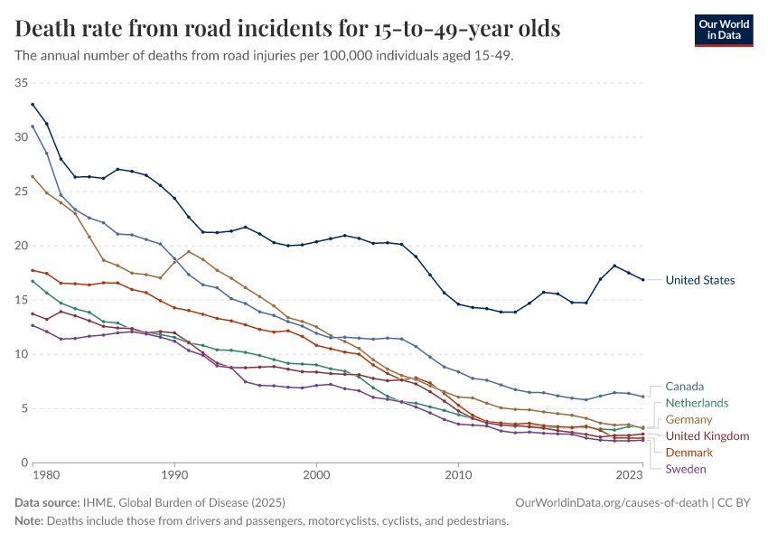 “Data Page: Death rate from road incidents for 15-to-49-year olds”, part of the following publication: Esteban Ortiz-Ospina and Max Roser (2016) - “Global Health”. Data adapted from IHME, Global Burden of Disease. Retrieved from https://tag-updates.owid.pages.dev:8789/20260211-174736/grapher/death-rate-from-road-accidents-for-15--to-49-year-olds.html [online resource] (archived on February 11, 2026).How to cite this data