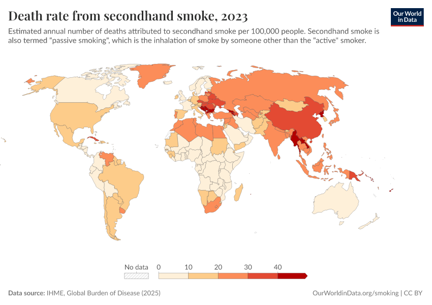 IHME, Global Burden of Disease (2025) – with major processing by Our World in Data. “Death rate from secondhand smoke” [dataset]. IHME, Global Burden of Disease, “Global Burden of Disease - Risk Factors - Deaths” [original data]. Retrieved February 27, 2026 from https://tag-updates.owid.pages.dev:8789/20260213-113303/grapher/death-rate-from-secondhand-smoke-gbd.html (archived on February 13, 2026).