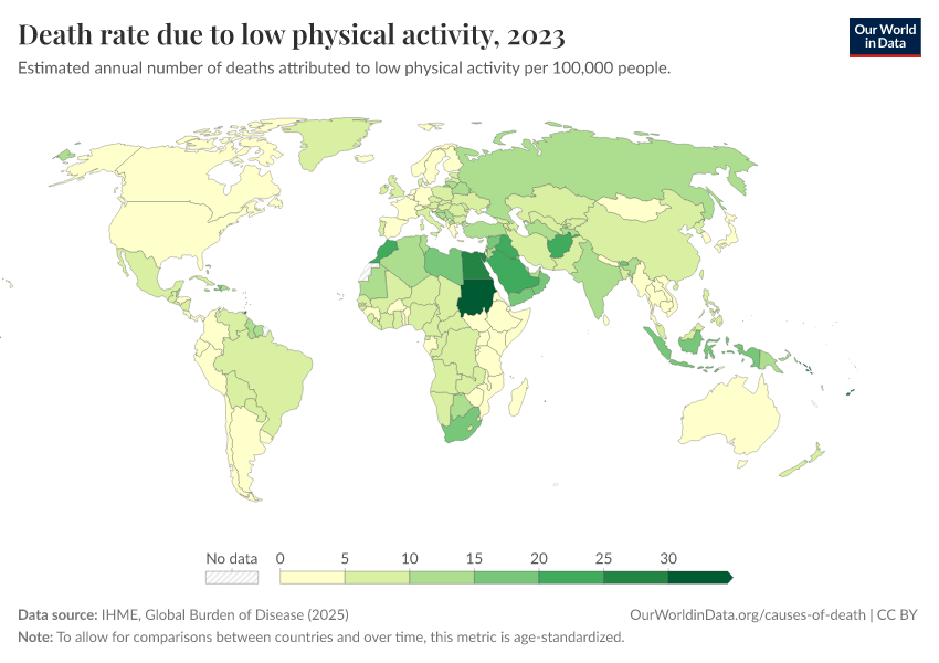 “Data Page: Death rate due to low physical activity”, part of the following publication: Esteban Ortiz-Ospina and Max Roser (2016) - “Global Health”. Data adapted from IHME, Global Burden of Disease. Retrieved from https://tag-updates.owid.pages.dev:8789/20260213-112438/grapher/death-rates-due-to-low-physical-activity.html [online resource] (archived on February 13, 2026).How to cite this data