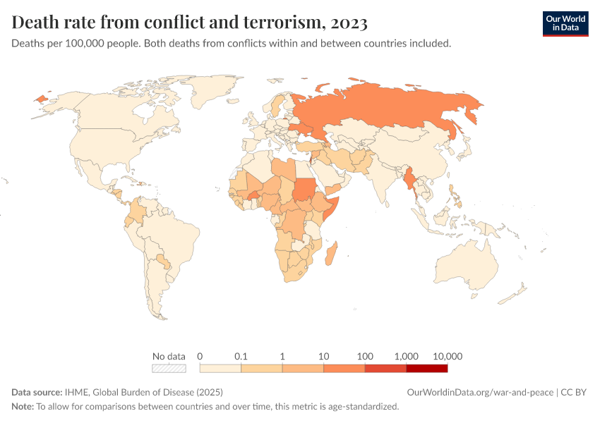 “Data Page: Death rate from conflict and terrorism”, part of the following publication: Esteban Ortiz-Ospina and Max Roser (2016) - “Global Health”. Data adapted from IHME, Global Burden of Disease. Retrieved from https://tag-updates.owid.pages.dev:8789/20260211-174736/grapher/death-rates-from-conflict-and-terrorism-gbd.html [online resource] (archived on February 11, 2026).How to cite this data