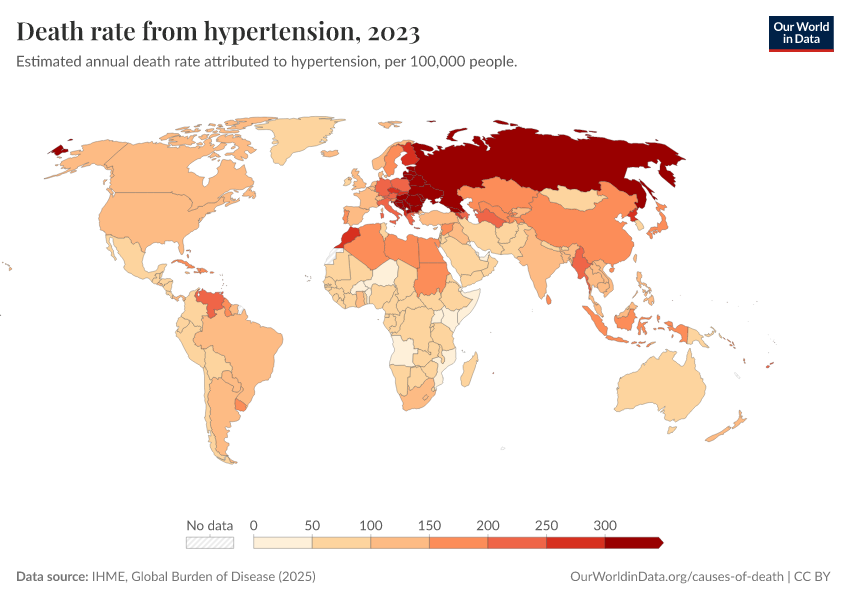 IHME, Global Burden of Disease (2025) – with major processing by Our World in Data. “Death rate from hypertension” [dataset]. IHME, Global Burden of Disease, “Global Burden of Disease - Risk Factors - Deaths” [original data]. Retrieved February 27, 2026 from https://tag-updates.owid.pages.dev:8789/20260213-112438/grapher/death-rates-from-high-blood-pressure-gbd.html (archived on February 13, 2026).