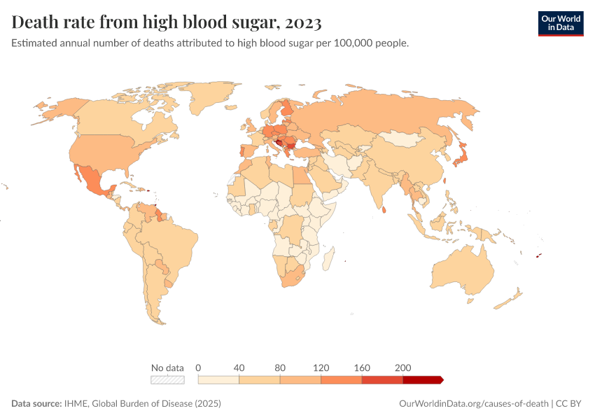 “Data Page: Death rate from high blood sugar”, part of the following publication: Esteban Ortiz-Ospina and Max Roser (2016) - “Global Health”. Data adapted from IHME, Global Burden of Disease. Retrieved from https://tag-updates.owid.pages.dev:8789/20260213-112438/grapher/death-rates-from-high-blood-sugar-gbd.html [online resource] (archived on February 13, 2026).How to cite this data