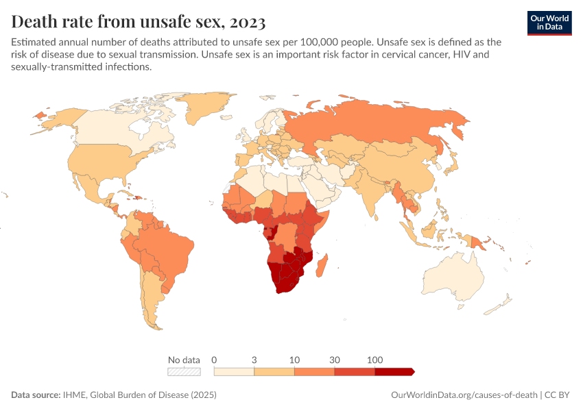 IHME, Global Burden of Disease (2025) – with major processing by Our World in Data. “Death rate from unsafe sex” [dataset]. IHME, Global Burden of Disease, “Global Burden of Disease - Risk Factors - Deaths” [original data]. Retrieved February 27, 2026 from https://tag-updates.owid.pages.dev:8789/20260213-113303/grapher/death-rates-from-unsafe-sex-gbd.html (archived on February 13, 2026).