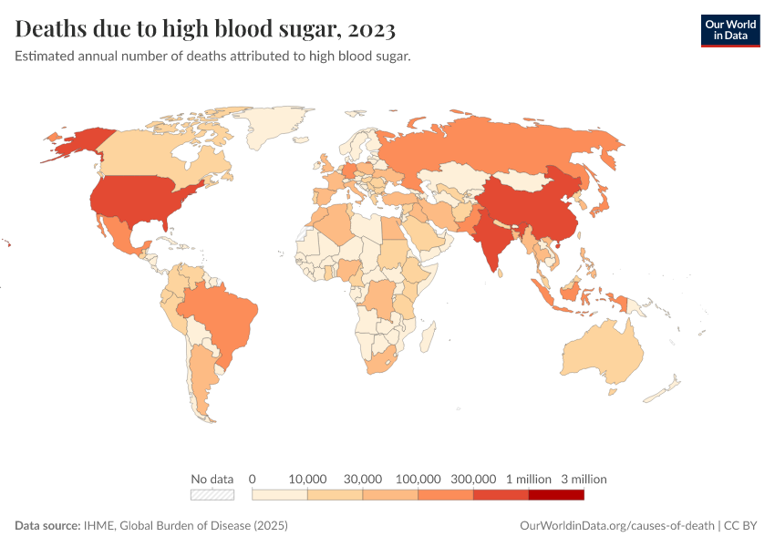 “Data Page: Deaths due to high blood sugar”, part of the following publication: Esteban Ortiz-Ospina and Max Roser (2016) - “Global Health”. Data adapted from IHME, Global Burden of Disease. Retrieved from https://tag-updates.owid.pages.dev:8789/20260213-112438/grapher/deaths-due-to-high-blood-sugar.html [online resource] (archived on February 13, 2026).How to cite this data
