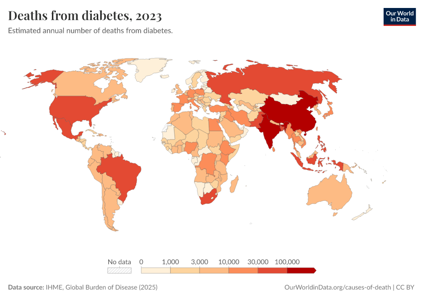 “Data Page: Deaths from diabetes”, part of the following publication: Esteban Ortiz-Ospina and Max Roser (2016) - “Global Health”. Data adapted from IHME, Global Burden of Disease. Retrieved from https://tag-updates.owid.pages.dev:8789/20260211-174736/grapher/deaths-from-diabetes.html [online resource] (archived on February 11, 2026).How to cite this data