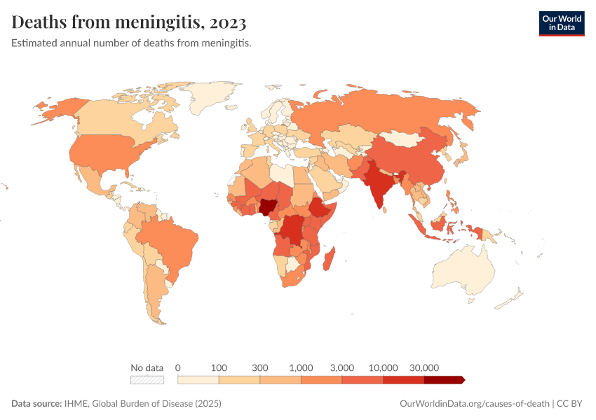 “Data Page: Deaths from meningitis”, part of the following publication: Esteban Ortiz-Ospina and Max Roser (2016) - “Global Health”. Data adapted from IHME, Global Burden of Disease. Retrieved from https://tag-updates.owid.pages.dev:8789/20260211-174736/grapher/deaths-from-meningitis.html [online resource] (archived on February 11, 2026).How to cite this data