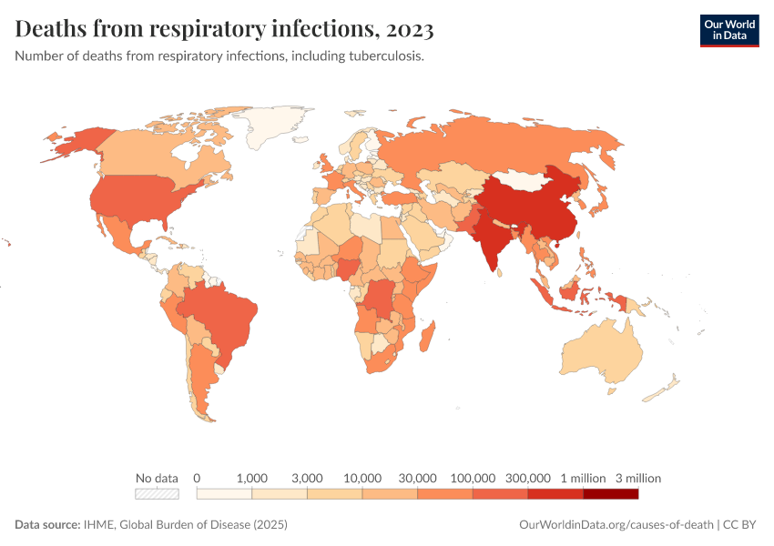 “Data Page: Deaths from respiratory infections”, part of the following publication: Esteban Ortiz-Ospina and Max Roser (2016) - “Global Health”. Data adapted from IHME, Global Burden of Disease. Retrieved from https://tag-updates.owid.pages.dev:8789/20260211-174736/grapher/deaths-from-respiratory-infections.html [online resource] (archived on February 11, 2026).How to cite this data
