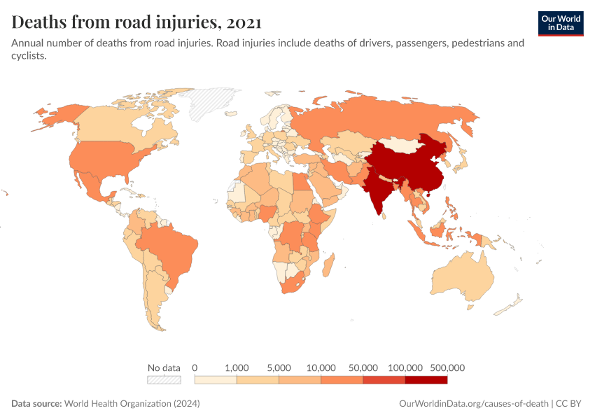 “Data Page: Deaths from road injuries”, part of the following publication: Esteban Ortiz-Ospina and Max Roser (2016) - “Global Health”. Data adapted from World Health Organization. Retrieved from https://tag-updates.owid.pages.dev:8789/20250909-093708/grapher/deaths-from-road-injuries.html [online resource] (archived on September 9, 2025).How to cite this data