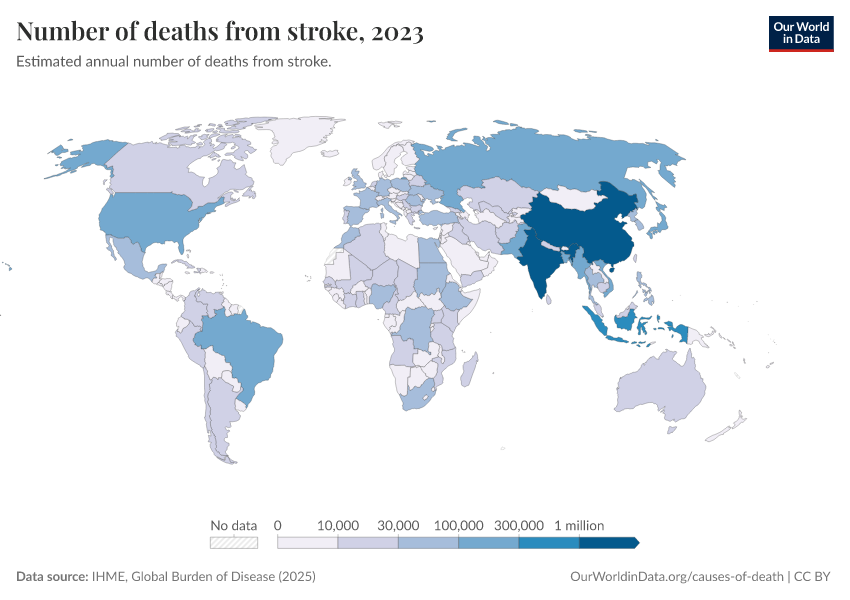 “Data Page: Number of deaths from stroke”, part of the following publication: Esteban Ortiz-Ospina and Max Roser (2016) - “Global Health”. Data adapted from IHME, Global Burden of Disease. Retrieved from https://tag-updates.owid.pages.dev:8789/20260211-174736/grapher/deaths-from-strokes.html [online resource] (archived on February 11, 2026).How to cite this data