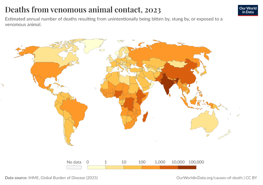 “Data Page: Deaths from venomous animal contact”, part of the following publication: Esteban Ortiz-Ospina and Max Roser (2016) - “Global Health”. Data adapted from IHME, Global Burden of Disease. Retrieved from https://tag-updates.owid.pages.dev:8789/20260211-174736/grapher/deaths-from-venomous-animal-contact.html [online resource] (archived on February 11, 2026).How to cite this data