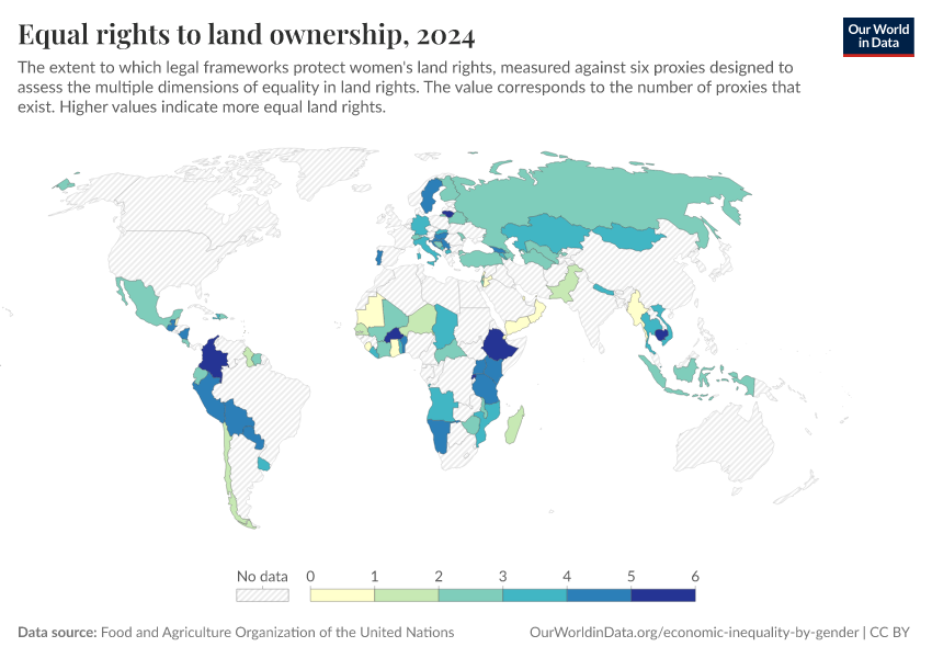 Food and Agriculture Organization of the United Nations – with minor processing by Our World in Data. “Equal rights to land ownership” [dataset]. Food and Agriculture Organization of the United Nations, “Data from multiple sources” [original data]. Retrieved February 27, 2026 from https://tag-updates.owid.pages.dev:8789/20251120-211749/grapher/degree-to-which-the-legal-framework-guarantees-womens-equal-rights-to-land-ownership-andor-control.html (archived on November 20, 2025).